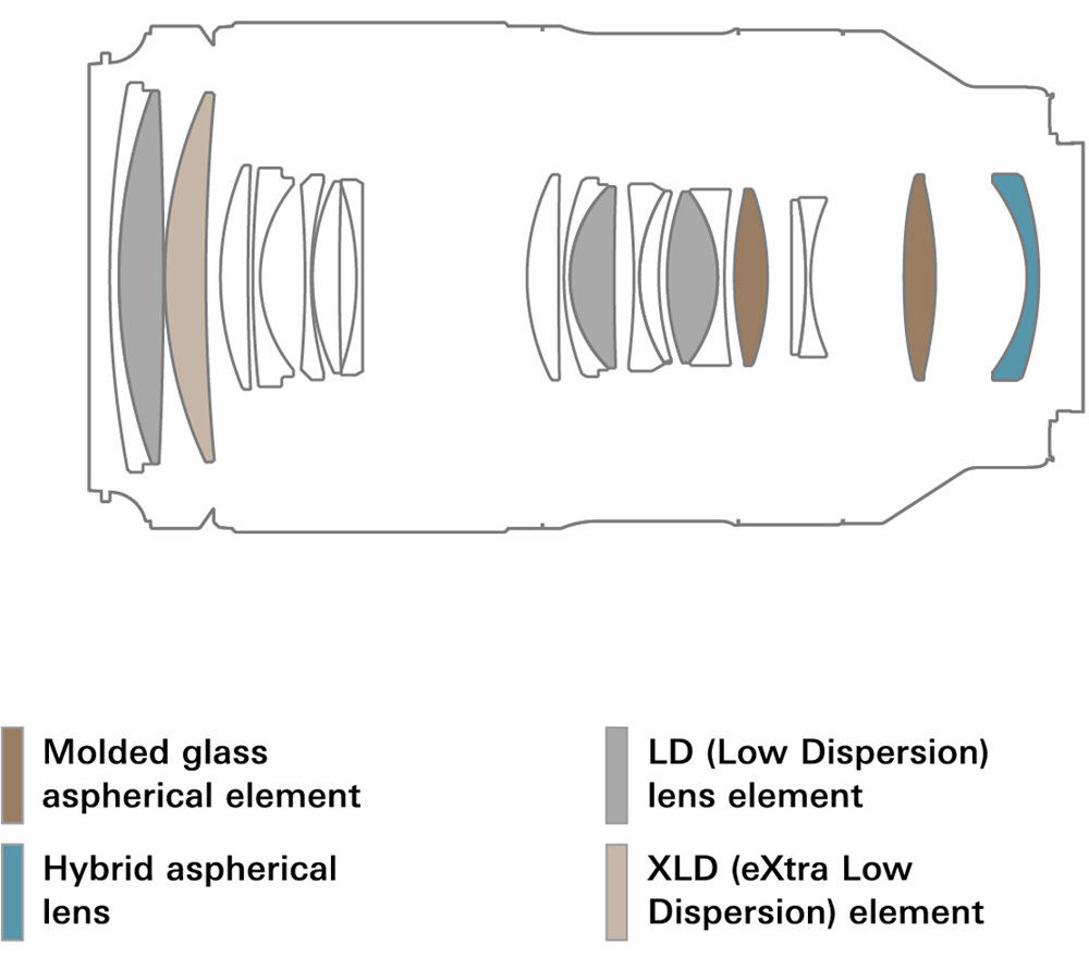 - 鏡組結構:15 群 20 枚(1 枚 XLD、3 枚 LD、2 枚 GM 非球面、1 枚混合非球面)