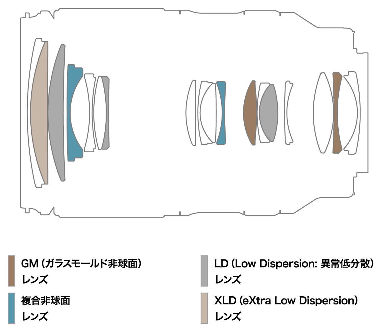 - 鏡組結構:14 群 18 枚(2 枚非球面、2 枚復合非球面、3 枚 LD、1 枚 XLD)