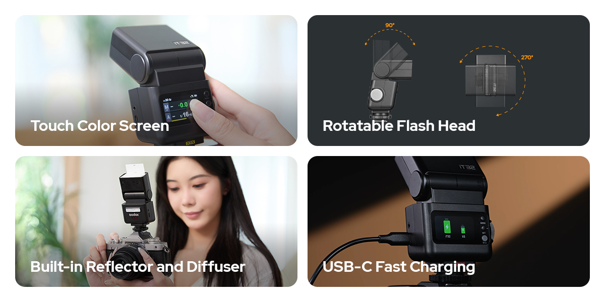 Godox iT32 閃光燈體積僅約 56 x 39 x 101mm、重量約 169 克,極致輕巧。它具備約 GN18 的閃光指數(ISO 100,公尺),在全功率輸出下的回電時間僅需約 1.5 秒,充飽電後可連續擊發約 510 次全功率閃光。設計上,iT32 配備了直覺的觸控螢幕,讓參數調整更便捷。閃光燈頭支援 270 度水平迴轉與 90 度垂直俯仰,方便進行跳燈作業。此外,閃光燈更內建了反射板、柔光片與 LED 造型燈,滿足基礎的布光需求。