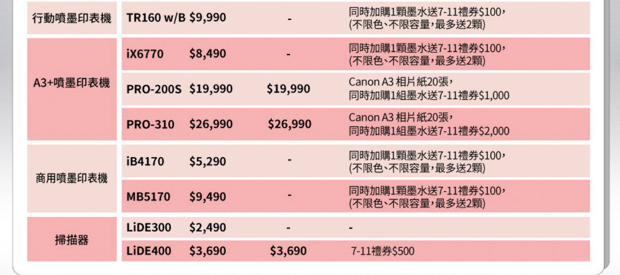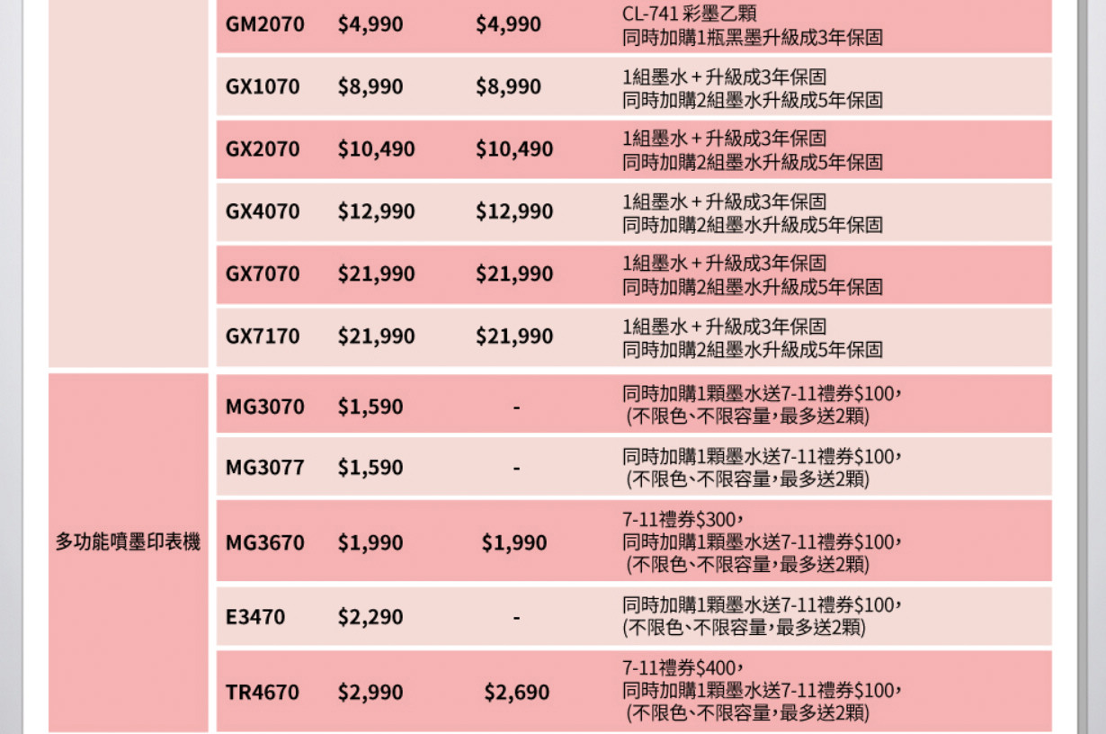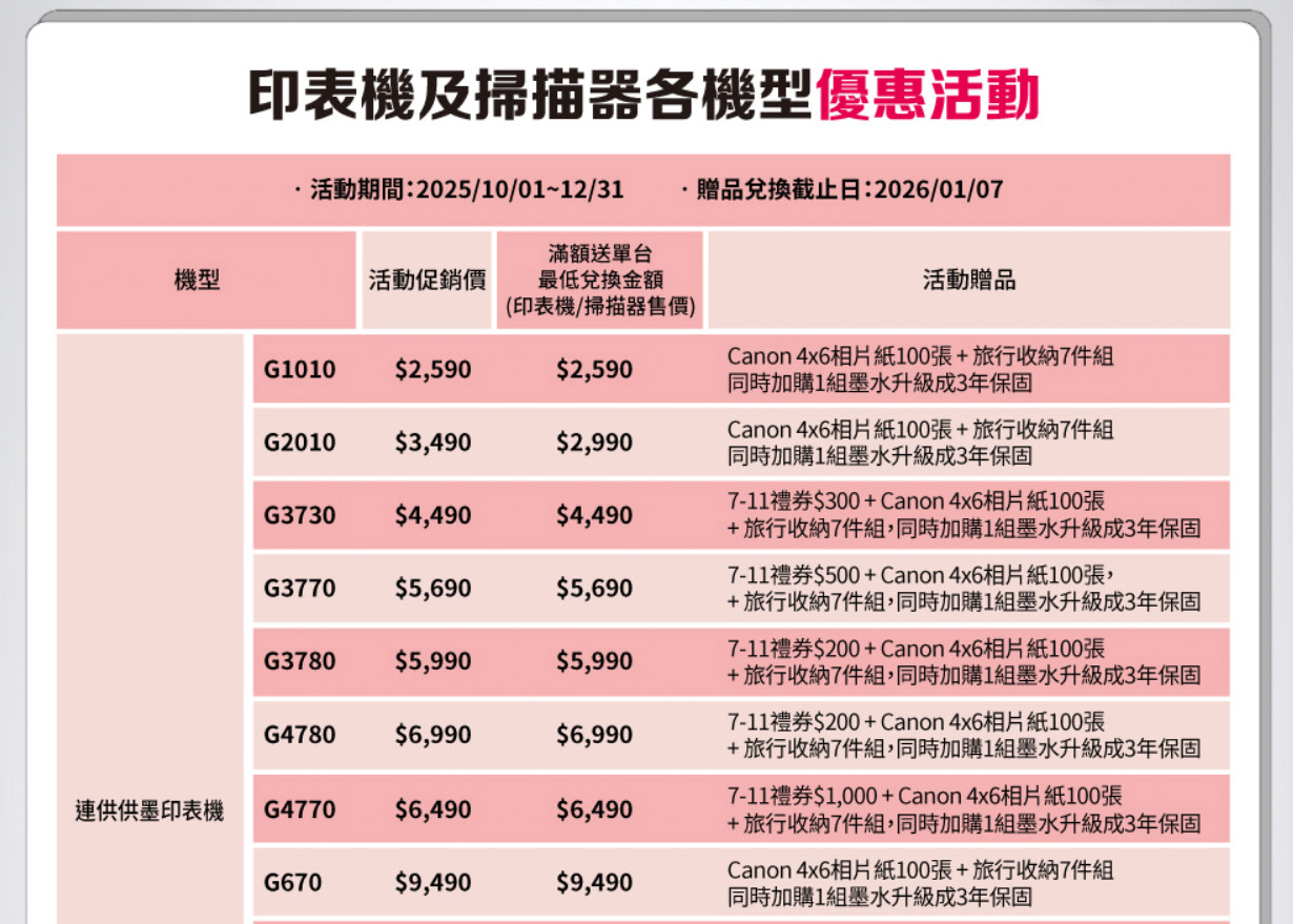 在歡慶連供印表機上市十週年之際,Canon 針對旗下三大連續供墨系列機型推出了豐富的限時回饋方案。活動期間凡購買 G 系列、GM 系列或 GX 系列連供印表機,完成登錄即可參加「月月抽 Canon PowerShot V10 影音相機」的抽獎活動,讓創作靈感隨身帶著走。針對家庭與學生用戶偏愛的 G 系列,登錄即贈送 Canon 原廠 4x6 相片列印紙 100 張與旅行收納 7 件組,指定機型更加碼送最高新台幣 1,000 元的 7-ELEVEN 禮券。此外,G 系列用戶若加購 1 組墨水,即可享升級至 3 年安心保固。至於專為商務環境打造的 GX 系列,登錄即贈 1 組原廠墨水並享 3 年保固,若加購 2 組墨水更可升級享有長達 5 年的超長保固,確保高效列印無後顧之憂。