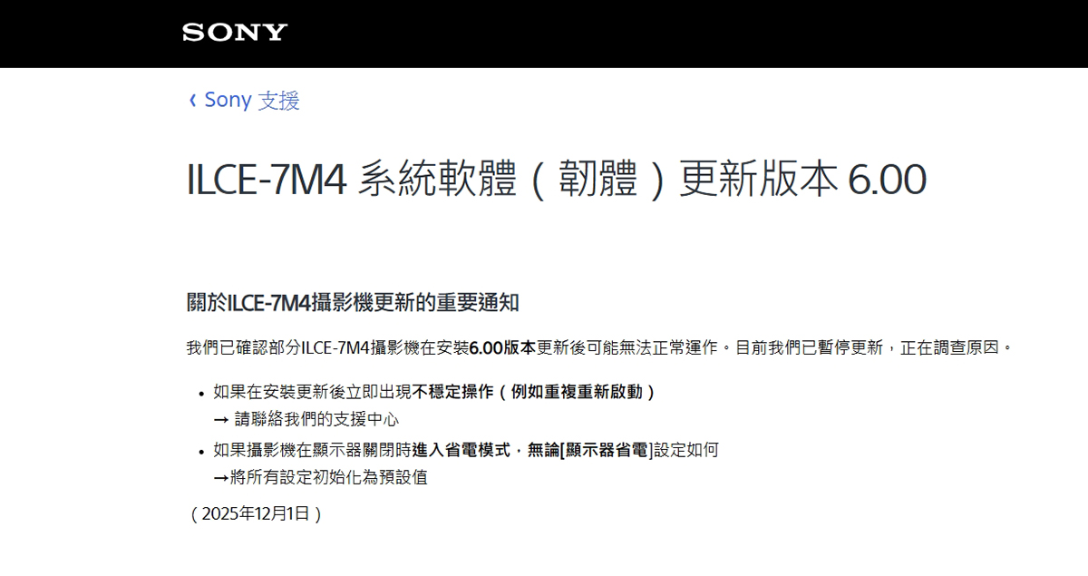 根據 Sony 官方支援網頁上的公告,確認 A7 V在安裝 Ver.6.00 的韌體後,部分機身可能無法正常運作。雖然確切的技術細節仍在調查中,但此重大異常已讓 Sony 立即下架了本次更新檔案。對於高階機身而言,系統韌體應以穩定性為首要考量,此次突發的暫停事件,凸顯了新版本可能存在影響核心運作的缺陷。因此,尚未更新的用戶應暫緩動作,等待官方發布修正後的版本。