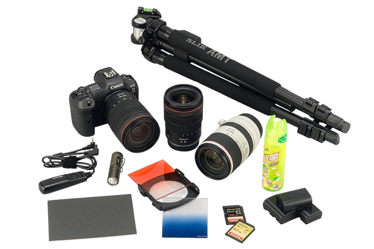 濾鏡方面,漸層減光鏡在傍晚藍調時刻尤其實用,當天空仍保有亮度、地面已趨於昏暗時,可透過濾鏡平衡畫面上下部的曝光,以減少後製負擔。手電筒則常被忽略,卻在實地拍攝時扮演重要角色,不僅確保在昏暗山區移動時的安全,必要時也可作為局部補光或光繪工具。最後,長時間曝光會讓感光元件持續運作,電池消耗速度較快,建議準備多顆備用電池尤佳。若前往高山或濕氣較重的環境,暖暖包與塑膠袋可協助減少鏡頭起霧問題,而保暖衣物與防蚊用品也屬基本配件,尤其春、夏兩季戶外蚊蟲活動頻繁,確實做好防蚊措施才能夠拍得盡興。