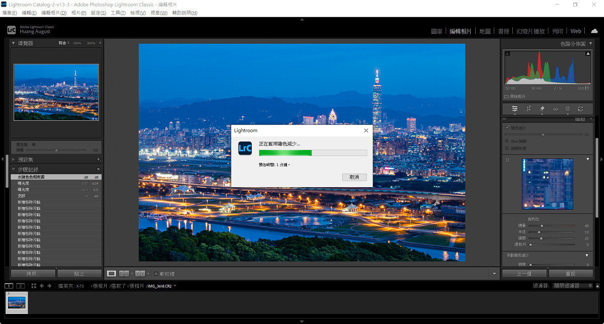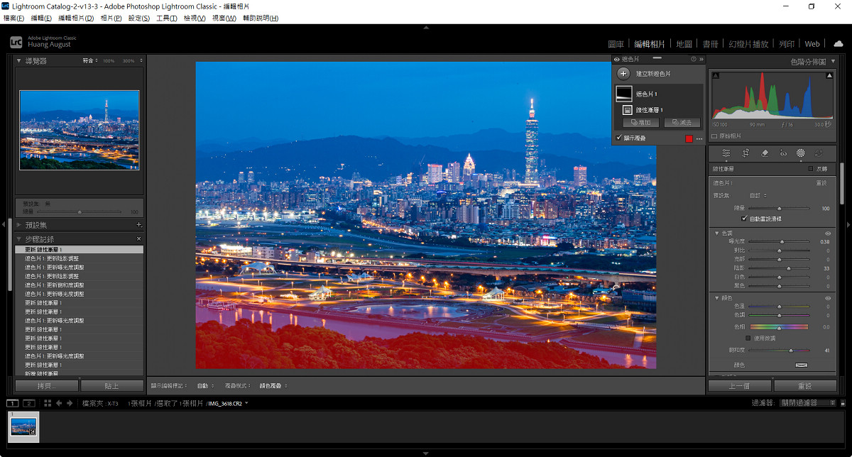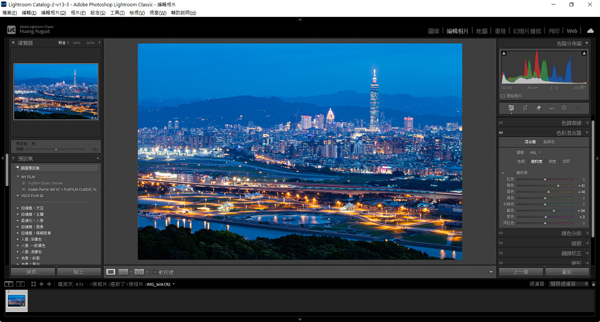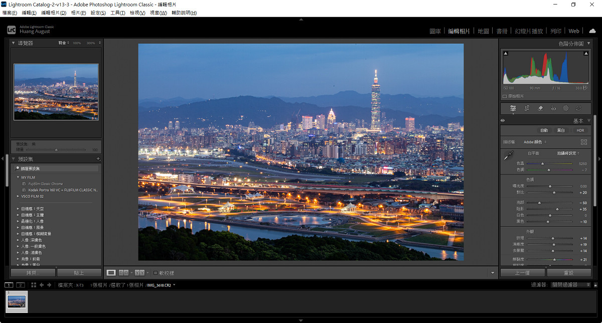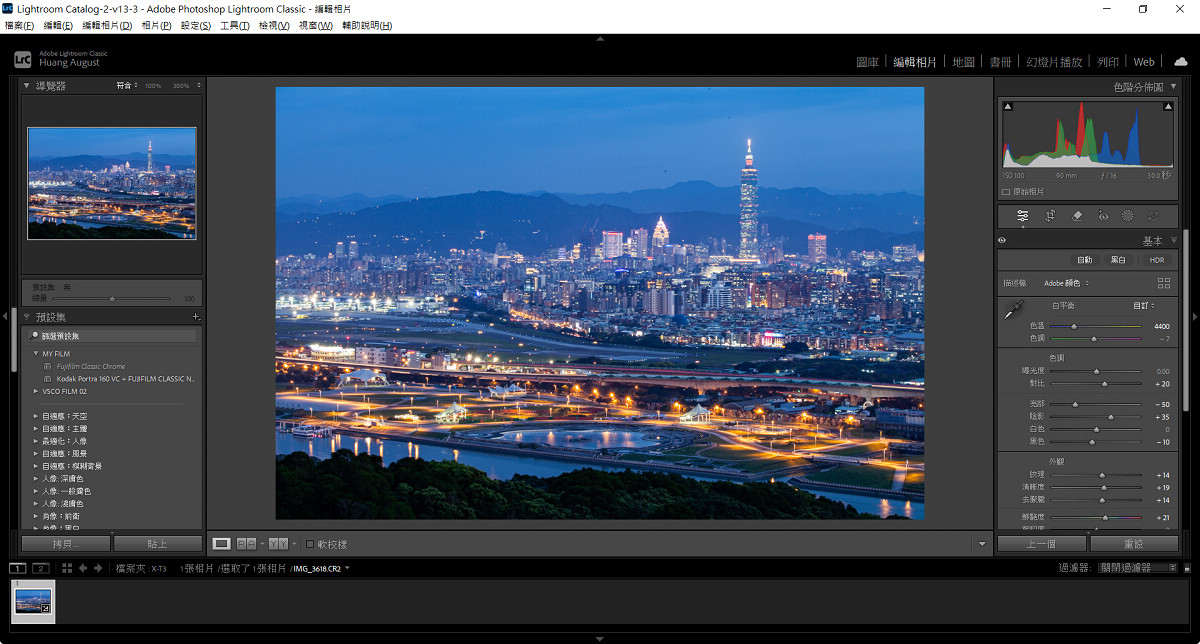 無論是都會或原野夜景,在拍攝完成後影像往往仍需適度調整,才能更接近拍攝當下的感受。由於高 ISO 與長時間曝光常伴隨著雜訊,適度降噪並增加銳利度能為影像增添可看性,此時可善用 AI 降噪以在清晰度與純淨度之間取得完美平衡。色溫校正同樣重要。城市夜景可保留冷暖對比,讓霓虹與路燈展現層次;自然夜色則偏向低飽和與深色調,以維持沉靜氛圍。至於動態範圍調整則以拉回高光細節為優先選項,避免亮部失真讓畫面有更均勻的呈現。以下便以 Adobe Lightroom Classic 來示範夜景的後製步驟,