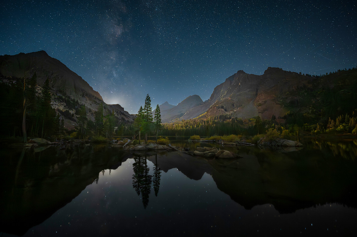 不同於都會地區的嚴重光害,由於原野郊外通常遠離都市塵囂,少了光線的干擾,因此在晴天的夜晚則更容易看到滿天星斗,故想拍攝自然的夜色風光,除了前述所提及的內容之外,漫天星辰也是不容錯過的重要元素。一般而言,地景搭配銀河是最吸引目光的安排之一,可以將相機固定於腳架上,透過超廣角鏡頭同時天空與地景囊括入鏡,以建立畫面的層次感。建議事前透過 Stellarium 等星象 APP 查詢銀河中心升起的時間與方位,並配合中央氣象署提供的月相資料,選擇無月(朔)前後各一個禮拜的夜晚進行拍攝,可有效避免月光干擾。實際拍攝時,建議以 F1.4 ~ F2.8 的大光圈搭配 ISO 1600 以上的高感光度(依機身表現而定),並將曝光時間控制在 30 秒以內避免星點產生拖曳;對焦方面則以手動方式轉至無限遠,並透過放大檢視銳利度以確認對焦狀態。