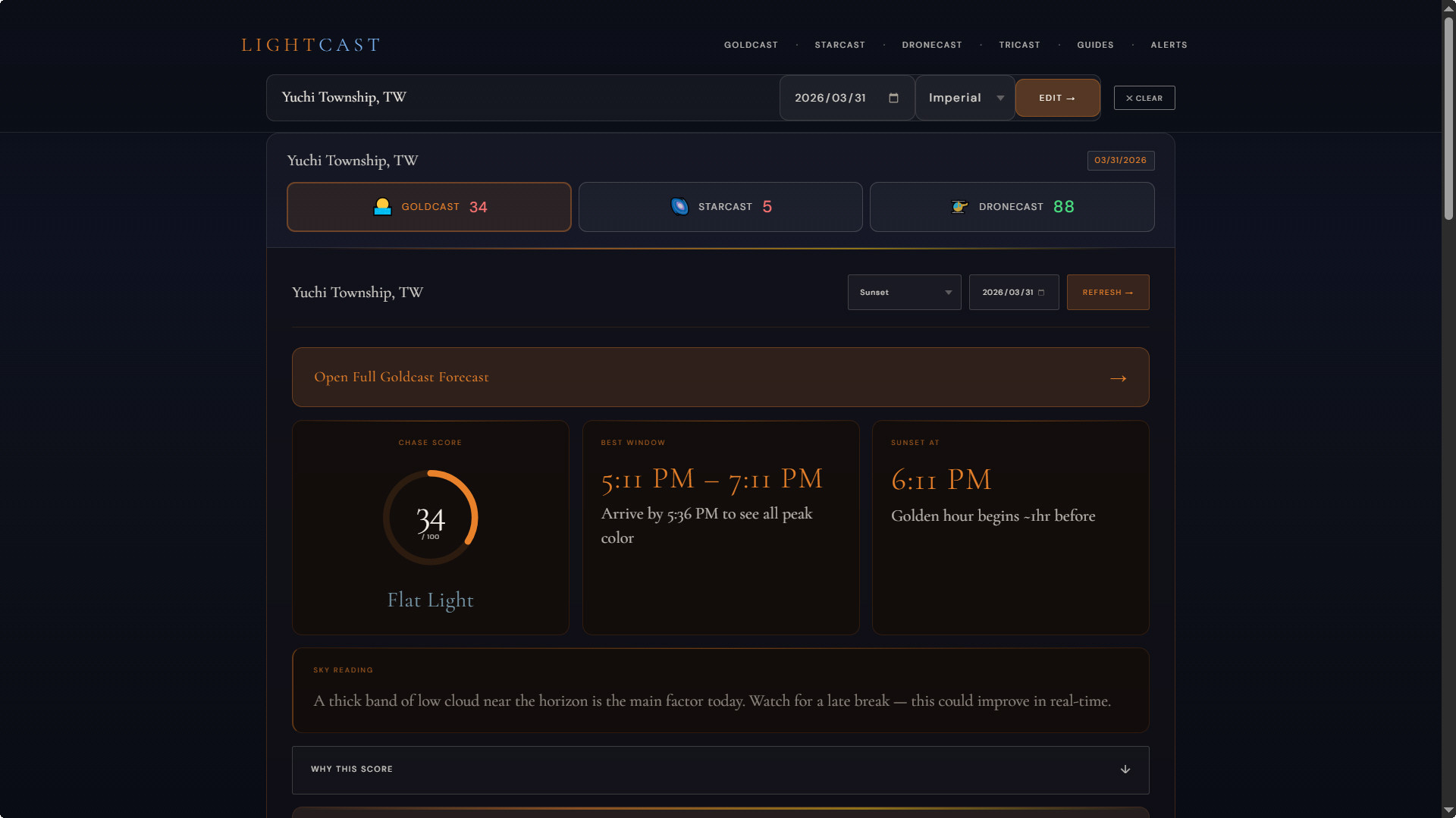 這套工具的核心在於其獨特的「LightCast 分數」系統,它將複雜的氣象數據轉化為 0 到 100 的百分比指標,並將出景機率劃分為四個等級。當分數處於 0 至 34 分時,屬於「平淡光影」(Flat light),代表缺乏層次;35 至 54 分則進入「值得一試」(Worth shooting)的範疇;若分數提升至 55 至 74 分,則意味著「優質條件」(Great conditions);一旦分數突破 75 分大關,即達到最高等級的「神級大景」(Epic Light)。這種清晰的分級制度,讓攝影師能一眼判斷當前的環境潛力。