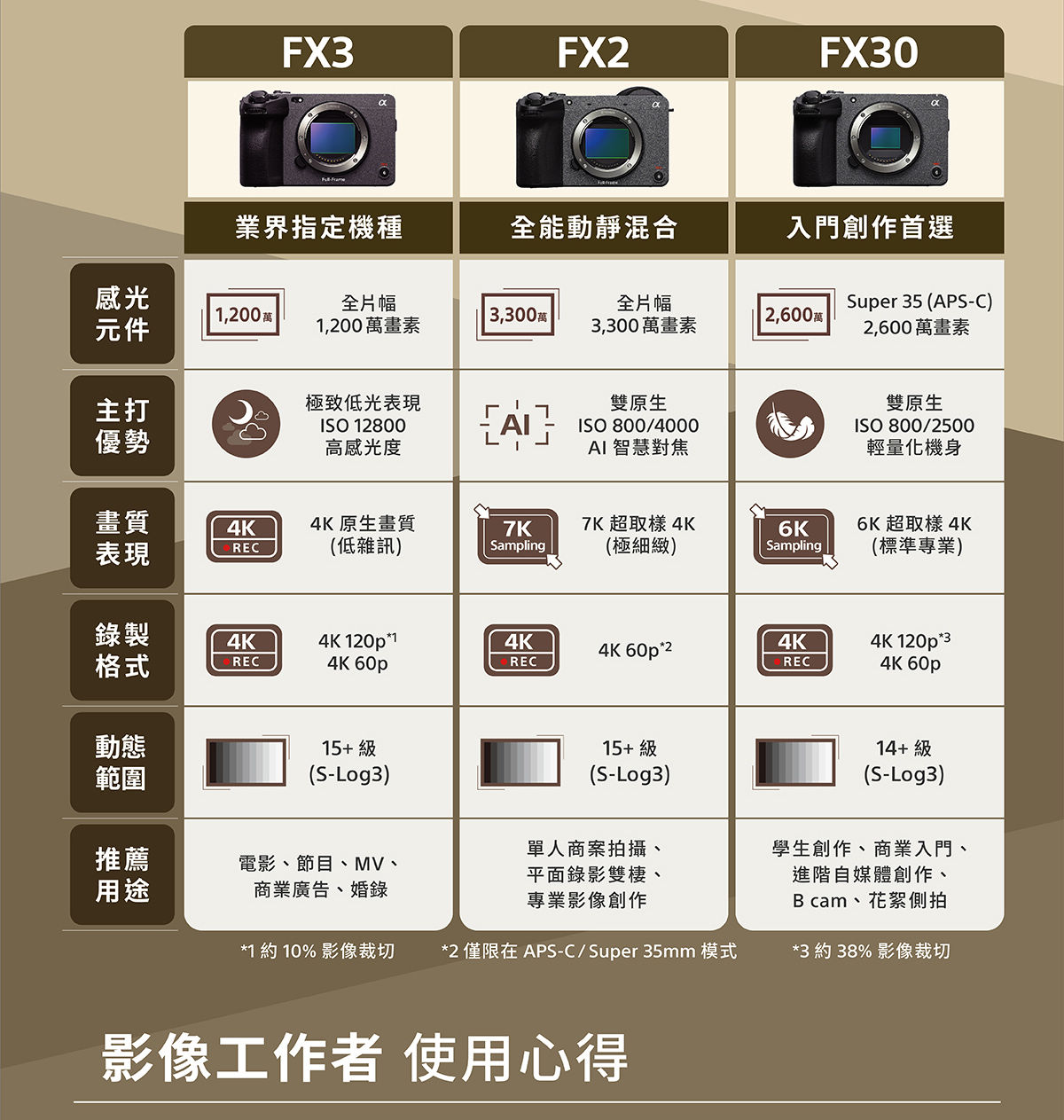 在機種定位上,FX3 以輕巧體積結合強大性能著稱,是目前業界許多專業影像工作者的指定用機,適合需要高度機動性的拍攝場合 。而本次方案中的 FX2 則強調全能的動靜態混合表現,內建了 AI 智慧對焦與專業級色彩技術,對於需要單人操作或快速對焦的商案拍攝極具優勢 。針對剛接觸攝影或是預算有限的學生,FX30 則提供了一個平易近人的選擇,雖然價格更為親民,但依然具備符合專業工作流程的功能,是邁入電影級創作的最佳跳板。